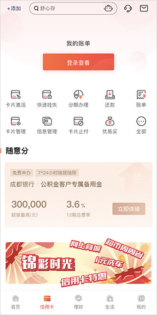2、在信用卡模块中,用户可以进行信用卡申请和挂失等操作。