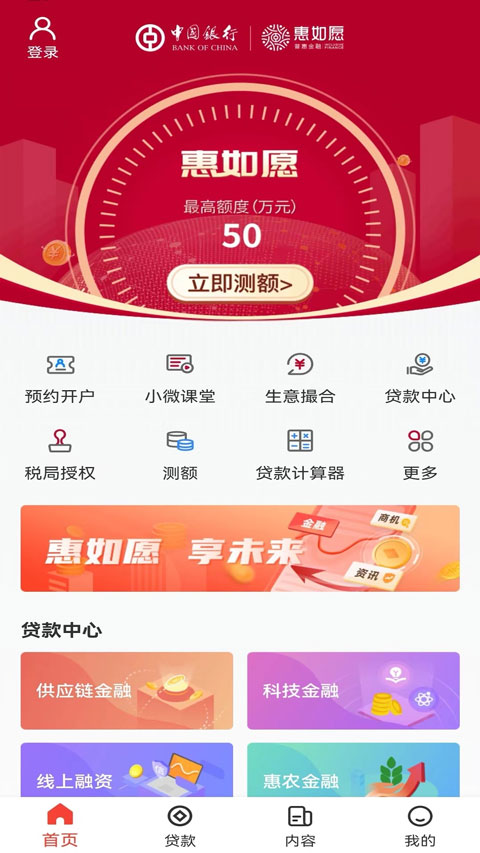 中国银行惠如愿app官方版是中国银行自主研发的一款普惠金融综合服务平台,简称为:惠如愿app,依托于互联网,以已客户手机为终端而开办各种惠普金融服务业务,致力为小微企业主或股东、个体工商户、创业者和涉农经营主体提供安全、便利、高效的惠普金融服务。