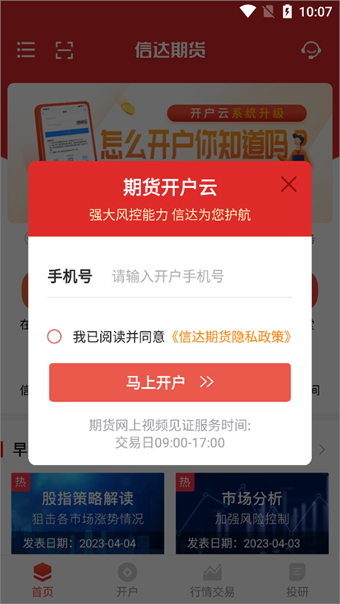 2、在弹出的期货开户云窗口中输入手机号并同意相关隐私政策后点击【马上开户】启动期货开户云进行开户