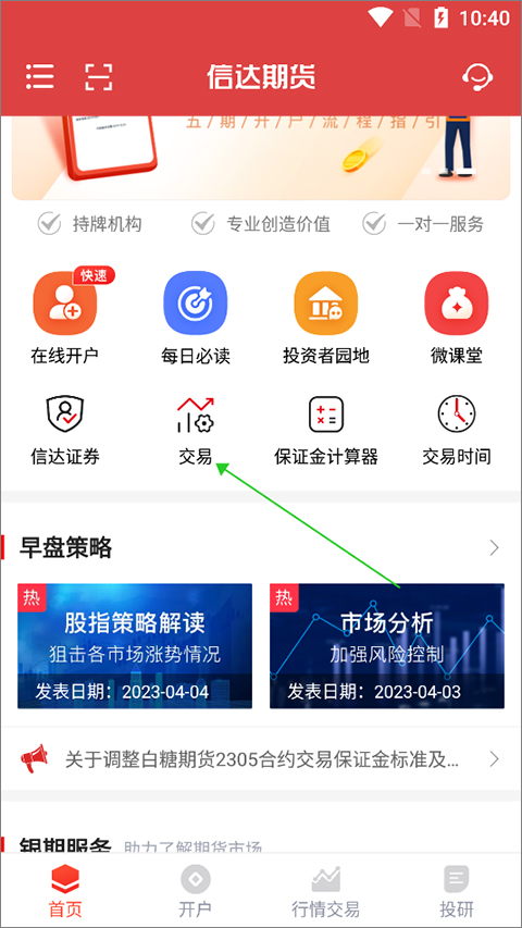 1、首先打开并登录信达期货app进入首页中点击【交易】