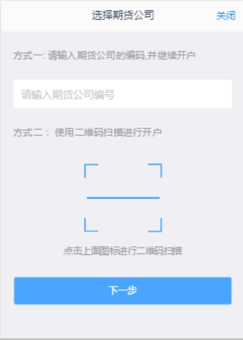 第一种可以直接在输入框输入期货公司编号进行开户,第二种点击扫描下万二维码开户,点击下一步