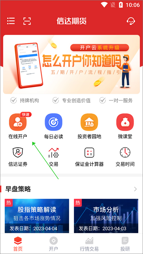 1、用户在手机上打开信达期货app进入首页后点击【在线开户】