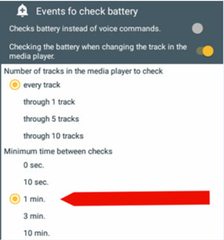 1、设置电池电量检查的窗口:-通过更改播放器的音轨,-代替呼叫语音助手;两次检查或更改玩家曲目之间的最短时间;电池检查之间的轨道数