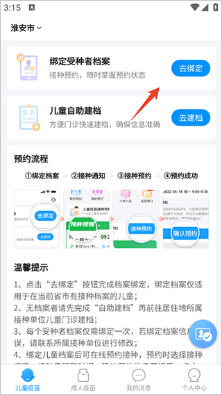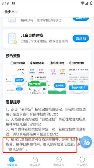 5、儿童疫苗预约时在绑定档案后方可在线预约接种,然后等待通知后确认通知上的信息后点击【确认预约】,接着就可以按照规定的时间到院进行接种即可