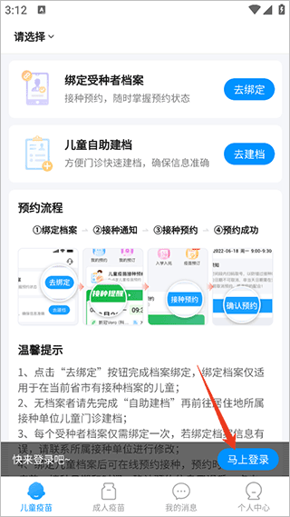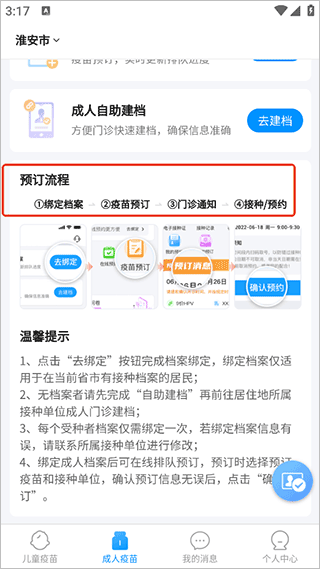 4、建档成功后,接着按照预约流程图操作,成人预约时需要进行疫苗预订,然后等待门诊通知,然后按照通知时间进行接种即可