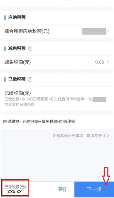 在标准申报页,可看到“其他扣除项目”下的“个人养老金”项目,点击“下一步”,可看到“应退税额”再次点击“下一步”,选择“申请退税”。
