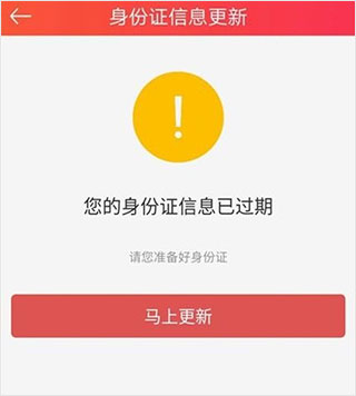 6、点击身份证信息更新,如果提示身份证信息已经过期,点击立即更新。