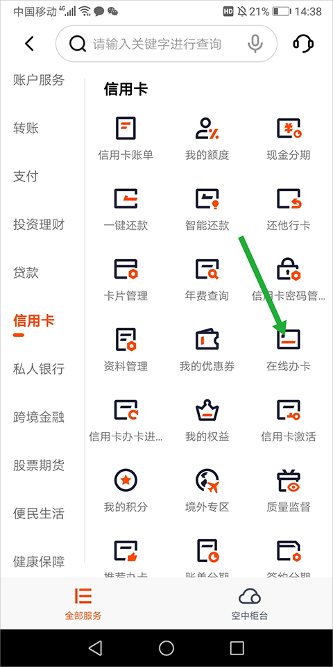 2、在打开的新页面中,点击页面左侧的【信用卡】,然后再点击页面右侧的【在线办卡】