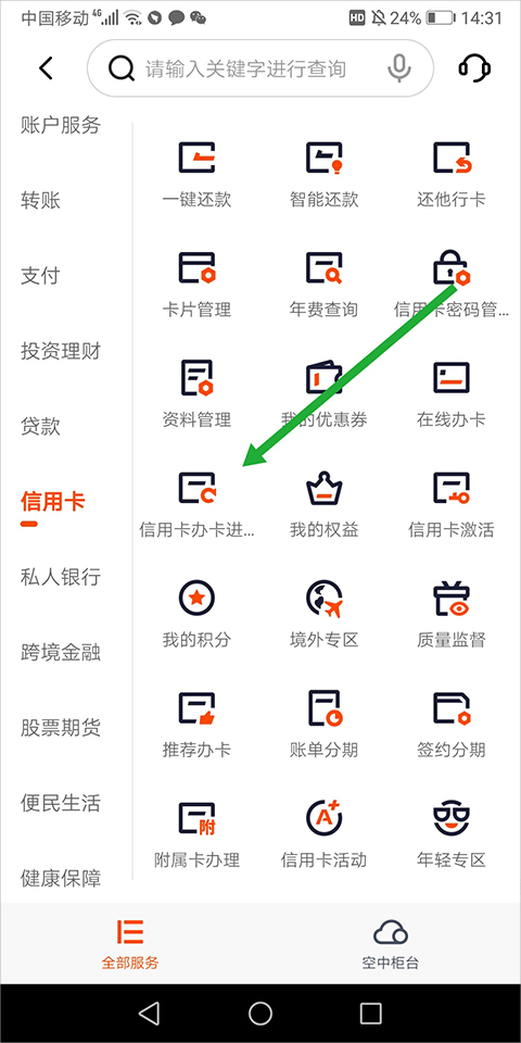 6、审核进度可以在首页中点击【更多】,在打开的新页面中选择信用卡服务项目中的【信用卡办卡进度】进行查询