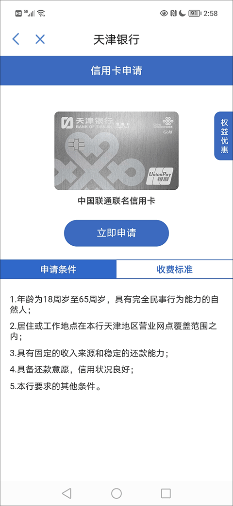 3、在信用卡申请界面看清楚申请条件、收费标准、权益优惠,找到并点击“立即申请”功能选项;