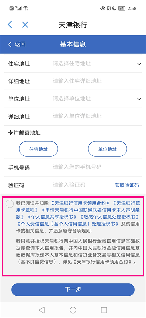 4、在具体申请界面填写好基本信息后,点亮红色方框内的内容,找到并点击“下一步”功能选项;