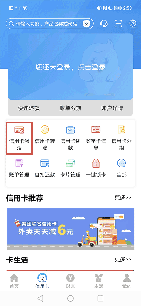 1、在信用卡主界面找到并点击“信用卡激活”功能选项;