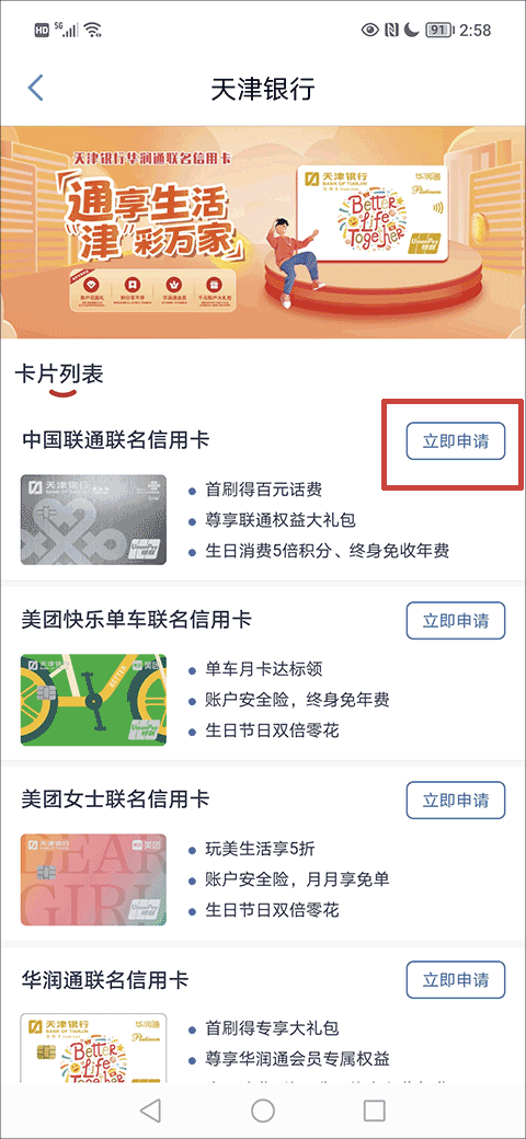 2、在卡片界面选择好你想要申请的信用卡类型,点击立即申请按钮;