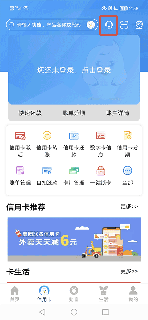 1、打开应用,在信用卡主界面找到并点击红色方框内的选项进入客服界面;