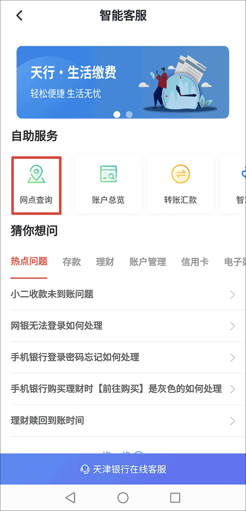 2、在智能客服界面找到并点击“网点查询”功能选项;