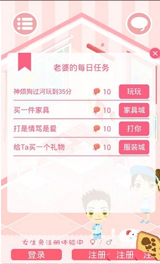 5、如果你是女生,在爱的小窝中就会看到“老婆的每日任务”;