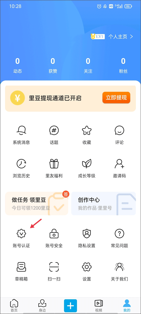 (1)点击下方菜单栏【我的】,这个界面上有很多的功能设置,如浏览历史、成长等级、账号认证、隐私设置等,点击“账号认证”。