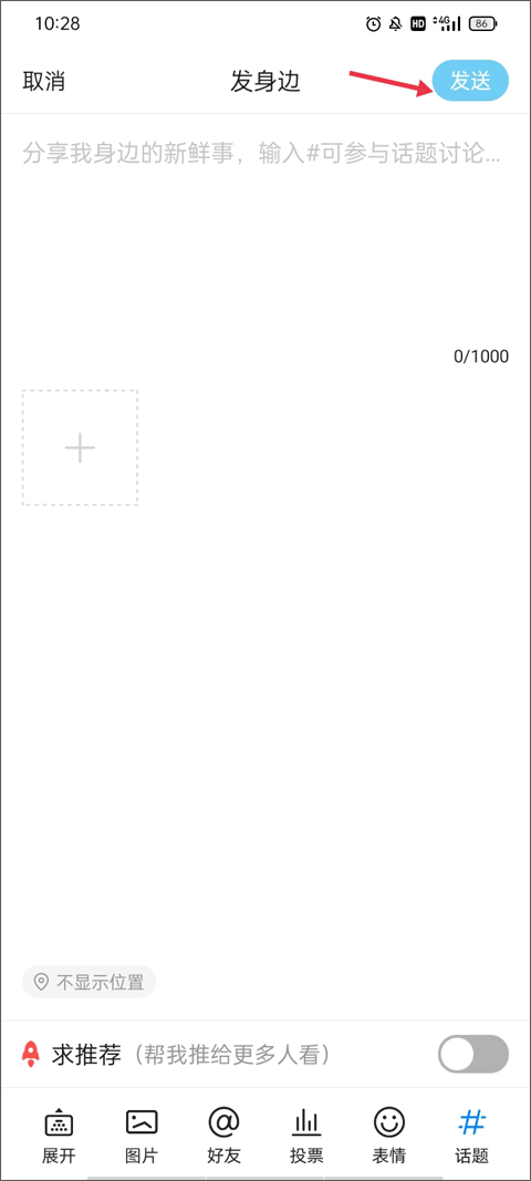 (3)这时候就可以开始填写文章的具体内容,并上传一些照片诠释一下,也可以添加话题,增加文章的热度,最后点击“发送”按钮即可。