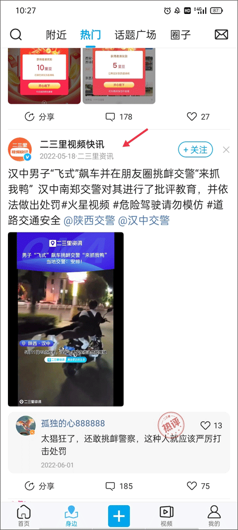 (1)打开软件,选择切换到【身边】界面,在这里你可以看到很多网友发布的帖子和视频,点击你想要拉黑的用户其中一篇文章。