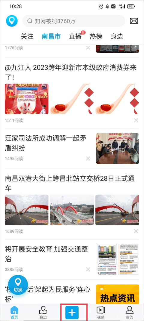 (1)app有五个板块,分别为首页、身边、发布、视频和我的,选择中间的“+”发布按钮。