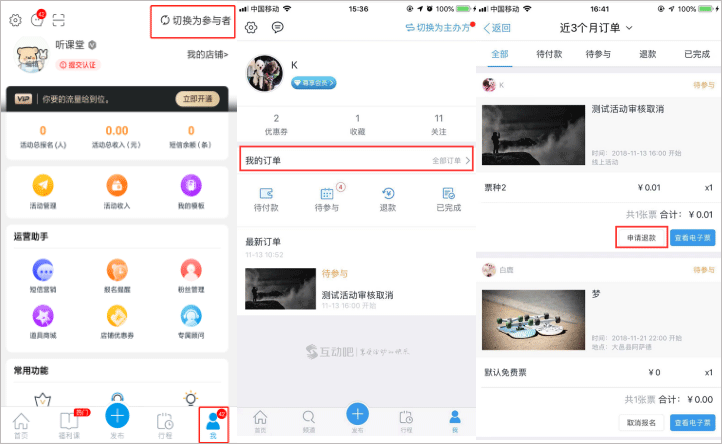 1、打开App,登录成功后→“我”→顶部点击“切换为参与者”→点击“全部订单”→点击某一活动下方的“申请退款”即可。