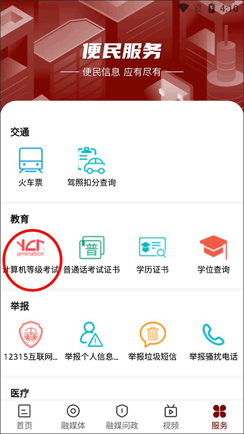 2、在便民服务列表中的教育一栏找到计算机等级考试然后点击它。