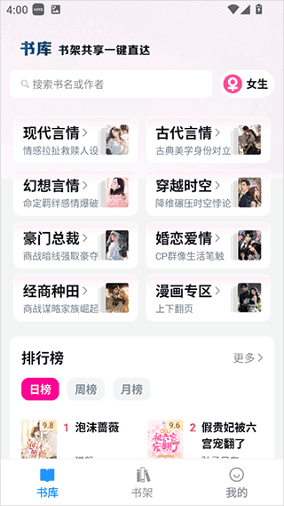 1、进入app后可以根据男频女频来切换适合男生或女生看的小说资源