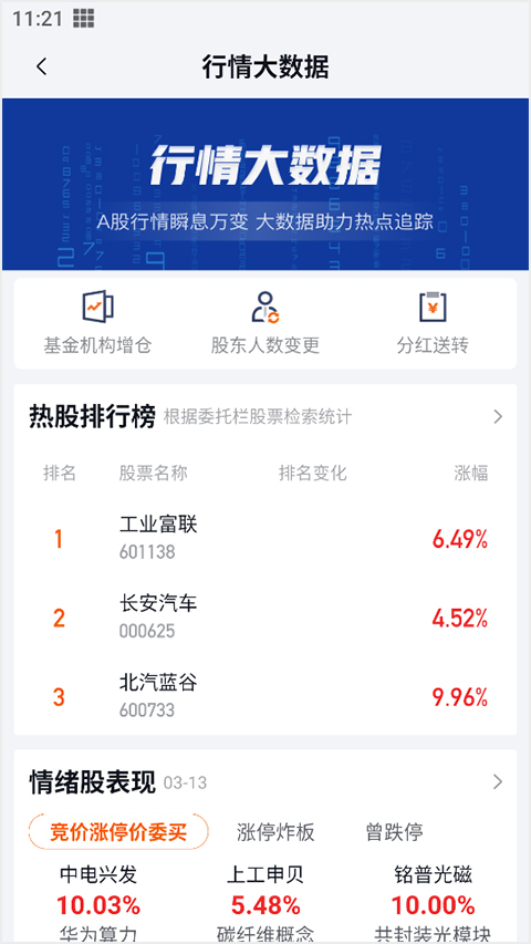 1、进入软件后,在行情页面选择行情大数据选项,也可以选择在上方进行搜索
