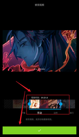 6、通过移动视频左右两边的滑块,对视频进行裁剪后,点击【勾】确定,如图所示: