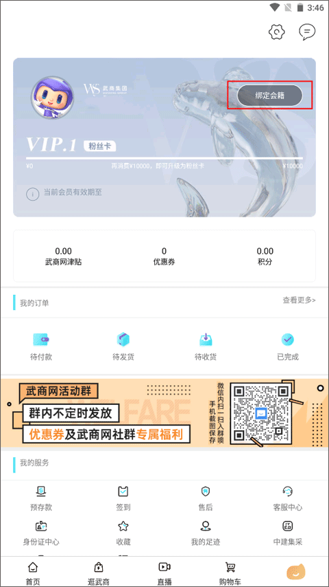 1、选择并切换到【我的】界面,点击右上方的“绑定会籍”。