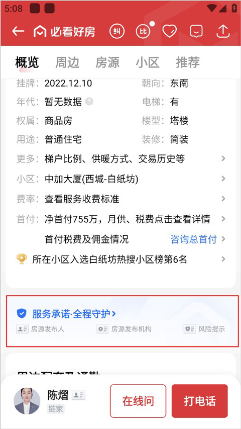 渠道二:打开app,点击任意一套二手房,点击任意一个经纪人头像进入经纪人点评页,点击“品质承诺”后的XX项服务承诺就可以查看该经纪人所属品牌的服务承诺内容。