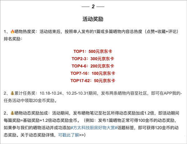 相比站内其他活动,品牌征稿活动奖励最为丰厚,而且是最实用的京东卡奖励+金币奖励。每期活动奖项设置除热度奖励外,更有积极投稿奖(按时间)、全民瓜分京东卡(按人头瓜分)等奖励,只要按活动要求发布内容就能拿钱!还不快快参加起来~