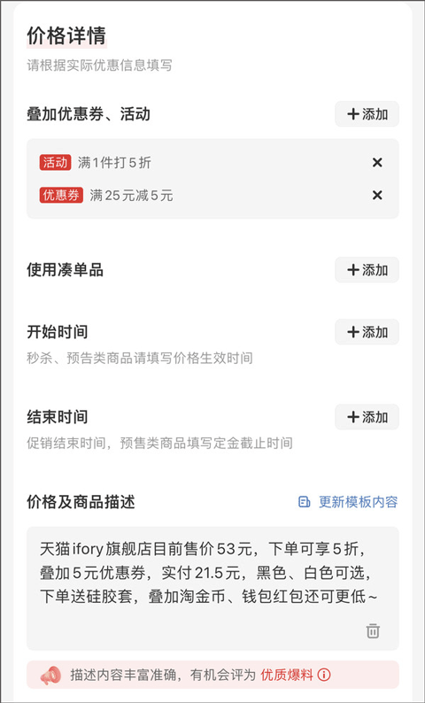 叠加优惠券、活动:选填项,商品如有满减折扣等优惠,可在此处添加优惠活动信息,注:此处优惠信息须为面向普罗大众的通用优惠,不包含不确定的价格优惠活动。