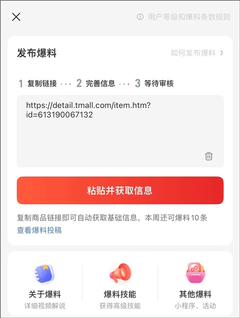 将发现的好价链接复制粘贴到爆料提交页面,此处需保证爆料的商品链接是干净准确的,不能是违反法律法规的有害链接。提交正确的商品链接,已经是创作成功的一半了哦!