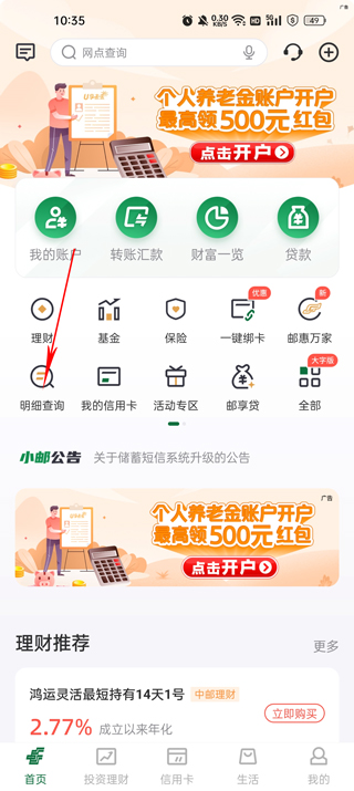 在邮储银行首页页面中,点击明细查询。
