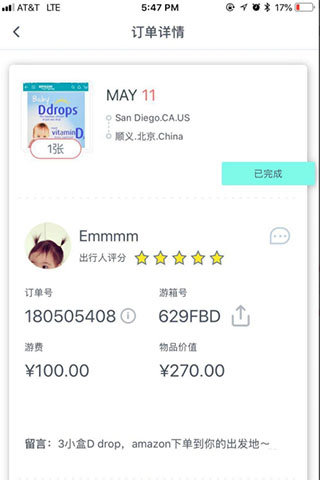 3、更高效:相对于国际转运繁琐复杂的流程,游箱app的帮带功能相当高效。从出行人出行到物品抵达目的地国家通常只需要2-3天,寄件人可通过游箱app与出行人随时沟通,实时了解订单状态。