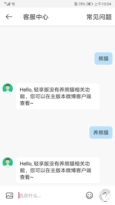 1、打开微博极速版app,在客服中心界面,输入“养熊猫”后,可看到系统提示轻享版暂时没有养熊猫的功能,可以在主版本查看养熊猫,
