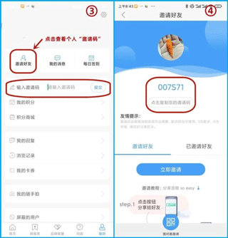 1、点击右下角“我的”进入登录页面,按步骤输入用户信息,输入“邀请码”,完成下载安装注册登录。例如:邀请人邀请码是“007S71”,填入该号码,邀请人好友列表即可显示你已被邀请完成下载安装注册登录。