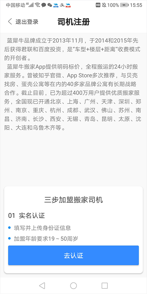 蓝犀牛司机端app是一款专门为司机用户提供加盟蓝犀牛搬家司机群体,以及在线接单、收入管理、收入提现等一站式司机业务服务的手机应用。司机用户只需要使用手机号进入验证码登录后,即可开启实名认证环节,在实名认证环节中输入自己的姓名和身份证号,以及上传身份证正反照片、驾驶证照片、车辆照片就可以完成认证。完成认证后就会有客服人员进行电话联系安排线下培训和考核,通过后即可免费成为一名蓝犀牛司机了。