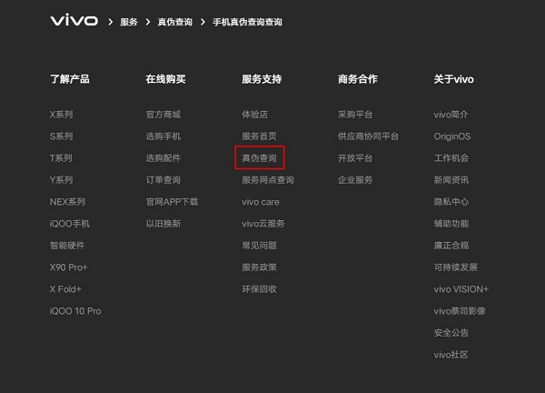 1、浏览器搜索“vivo官网”,在vivo官方网站中,翻至底部在“服务支持”中找到真伪查询。