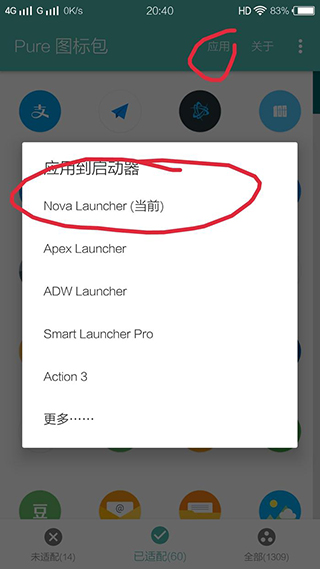 3、打开下载好的pure轻雨图标包app,进行适配,点击右上角的应用,选择Nova Launcher;