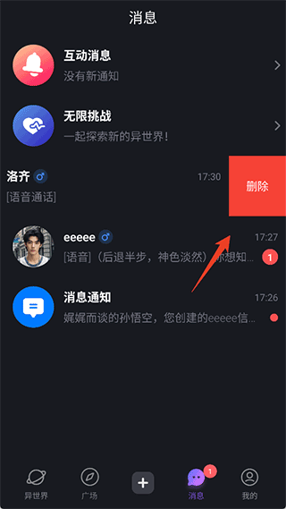 删除方式就是在消息界面中选择虚拟人后往左滑动下即可删除
