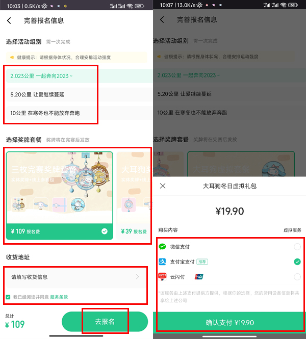 3、选择运动强度和奖牌套餐,填写信息后勾选协议,点去报名,确认支付即可。