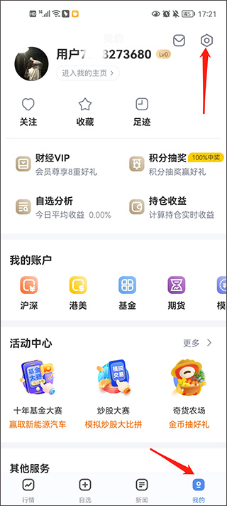 1、在“新浪财经极速版”窗口中,点击右下方“我的”菜单选项,在点击右上角“设置”符号选项。
