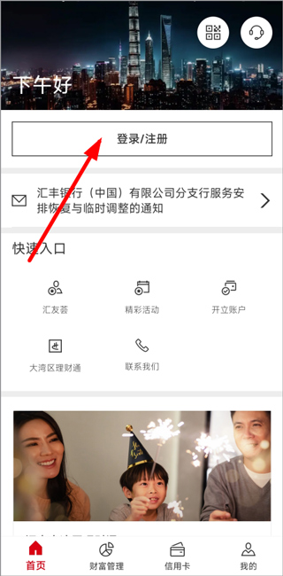 1、打开汇丰银行app,进入首页,登录个人账户;