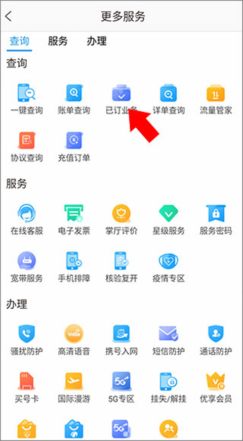 2、打开更多服务页面,在该页面用户可进行查询、办理和服务业务,在查询业务栏下找到并点击已订业务按钮;