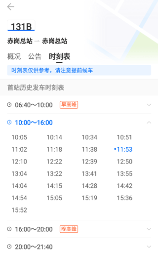 提供每一班车的预计发车时间、今日前序发车时间、历史发车时间