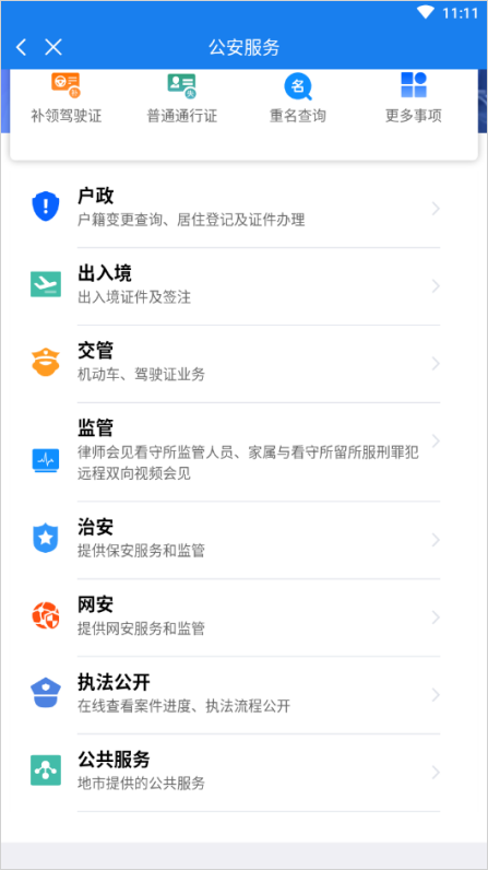 公安属于高频服务部门,公安的服务覆盖了全省的用户群体,APP优先完成了与公安厅移动端的对接并创建了公安服务专区。用户可通过该专区快捷方便的访问公安的相关服务,例如“补领驾驶证”“普通通行证”等多方面关于户政、出入境、交管、监管、治安、网安、执法公开、公共服务的服务查询和办理。