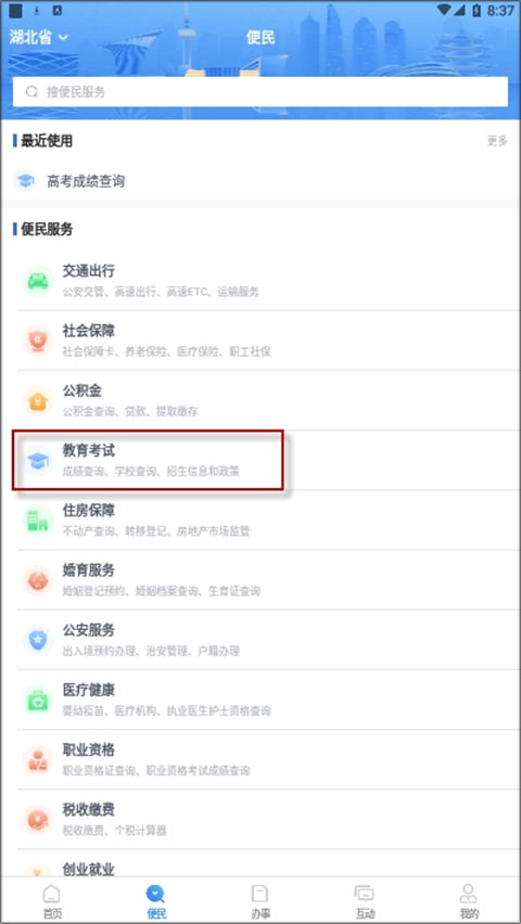 2、点击下面功能栏中的便民功能,找到教育考试这个功能类别;