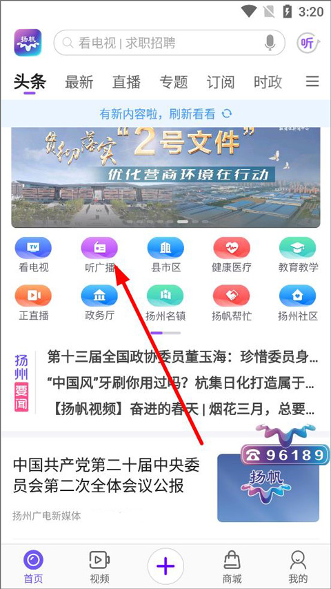 1、打开app,登录进入首页,用户在首页看电视、了解头条新闻、直播新闻、专题阅读等,点击听广播;